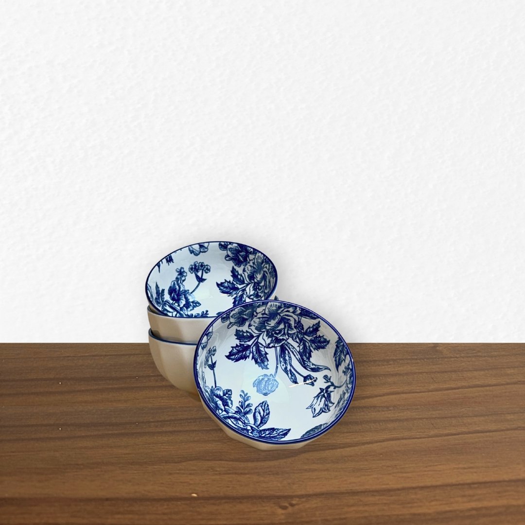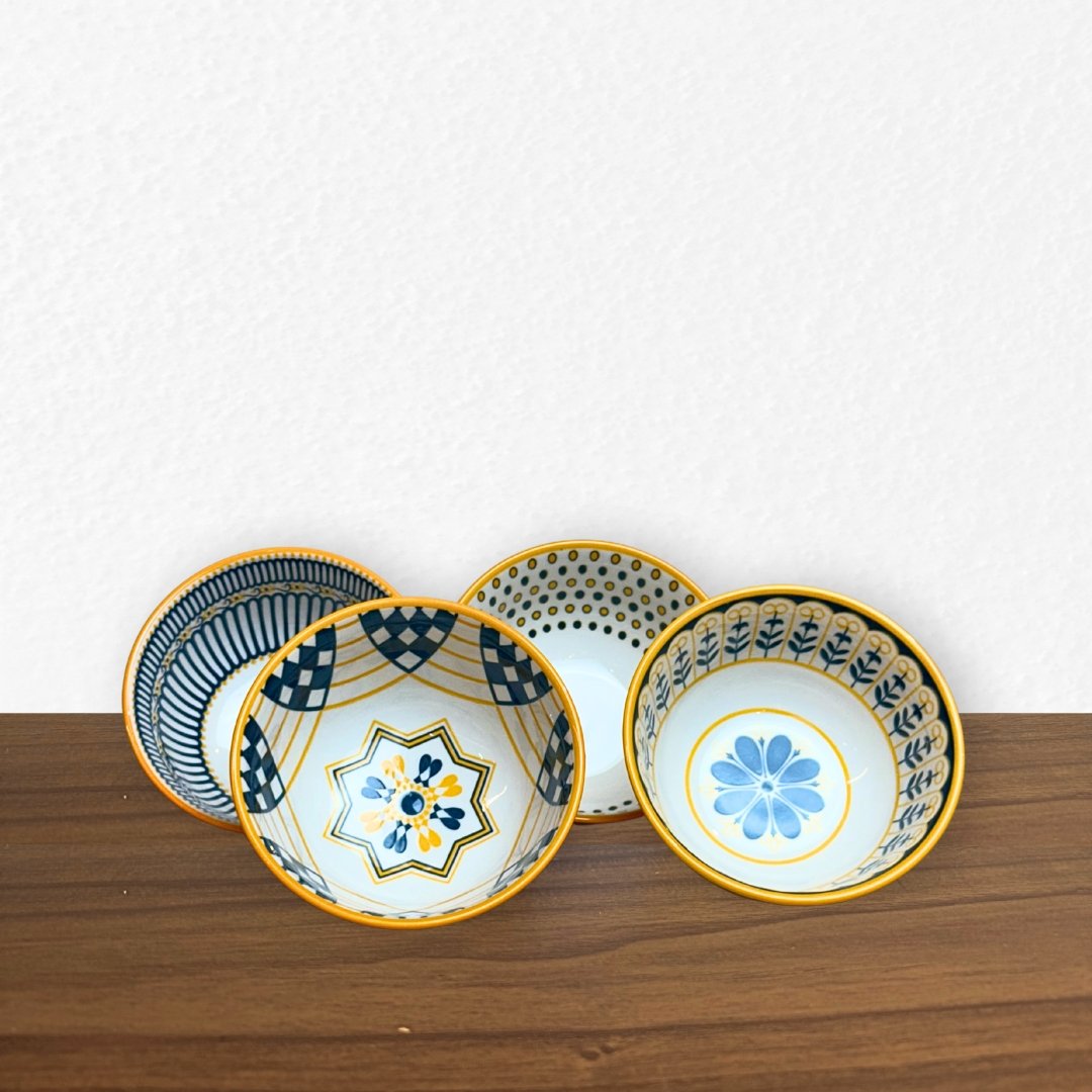 CONJUNTO COM 4 TIGELAS EM CERÂMICA BRANCA COM ESTAMPAS EM COMPOSÊ