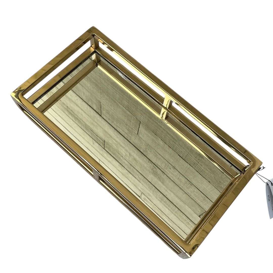 Bandeja em aço inox com acabamento dourado, base espelhada e alças laterais. Peça elegante e versátil, ideal para servir ou compor a decoração.