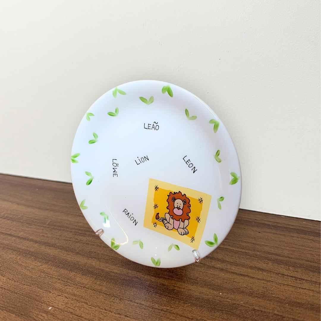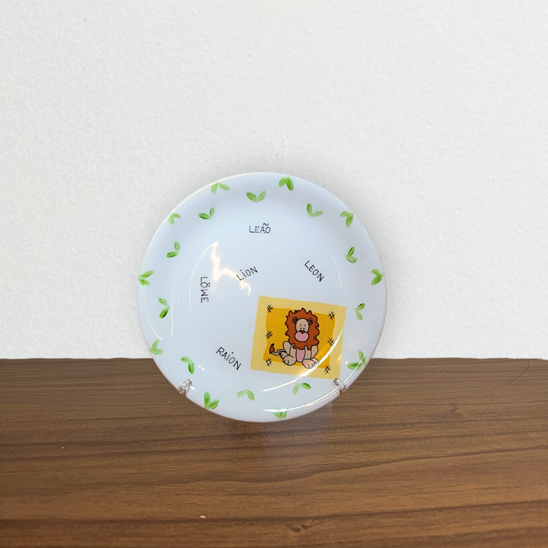 Este Prato de Sobremesa Infantil com desenho de Bichos é uma peça original e exclusiva com decoração feita à mão pela artesã, e dona do ateliê, Tatiana Maria.