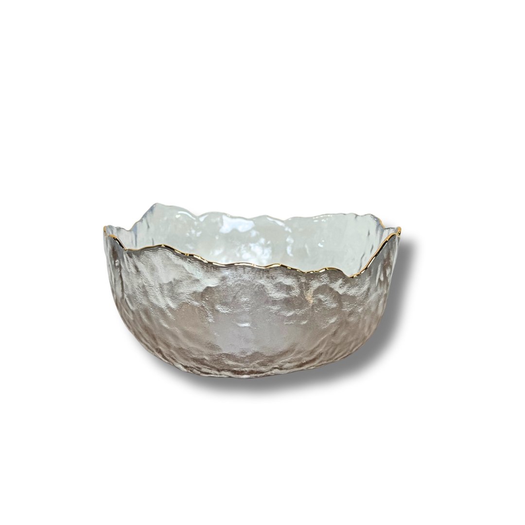 Este Bowl de Cristal possui um design delicado moderno e despojado, com sua borda ondulada em dourado.