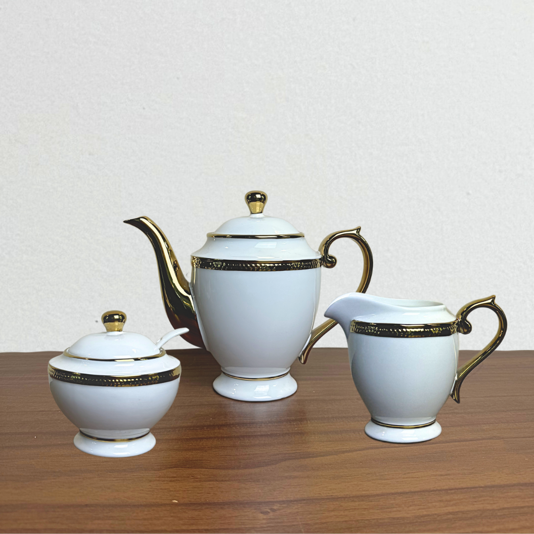 Contém: 1 bule com tampa, uma jarra e um açucareiro com tampa e colher.