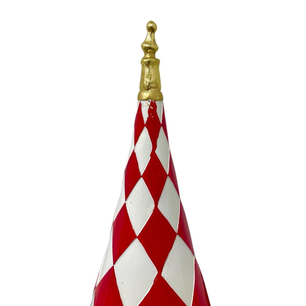 peça decorativa em formato de árvore de natal branca e vermelha com detalhes em dourado.