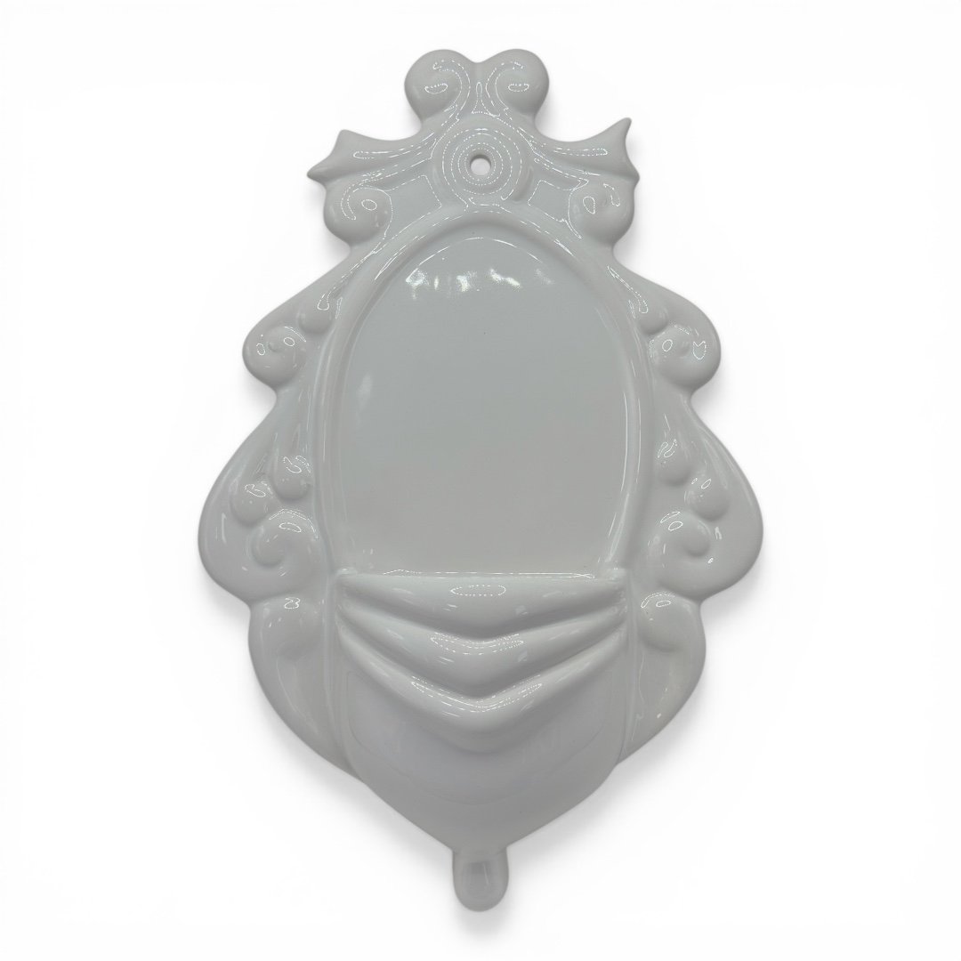 Pia para água benta em cerâmica branca para parede, com detalhes em relevo e design clássico, ideal para compor ambientes com devoção e elegância.