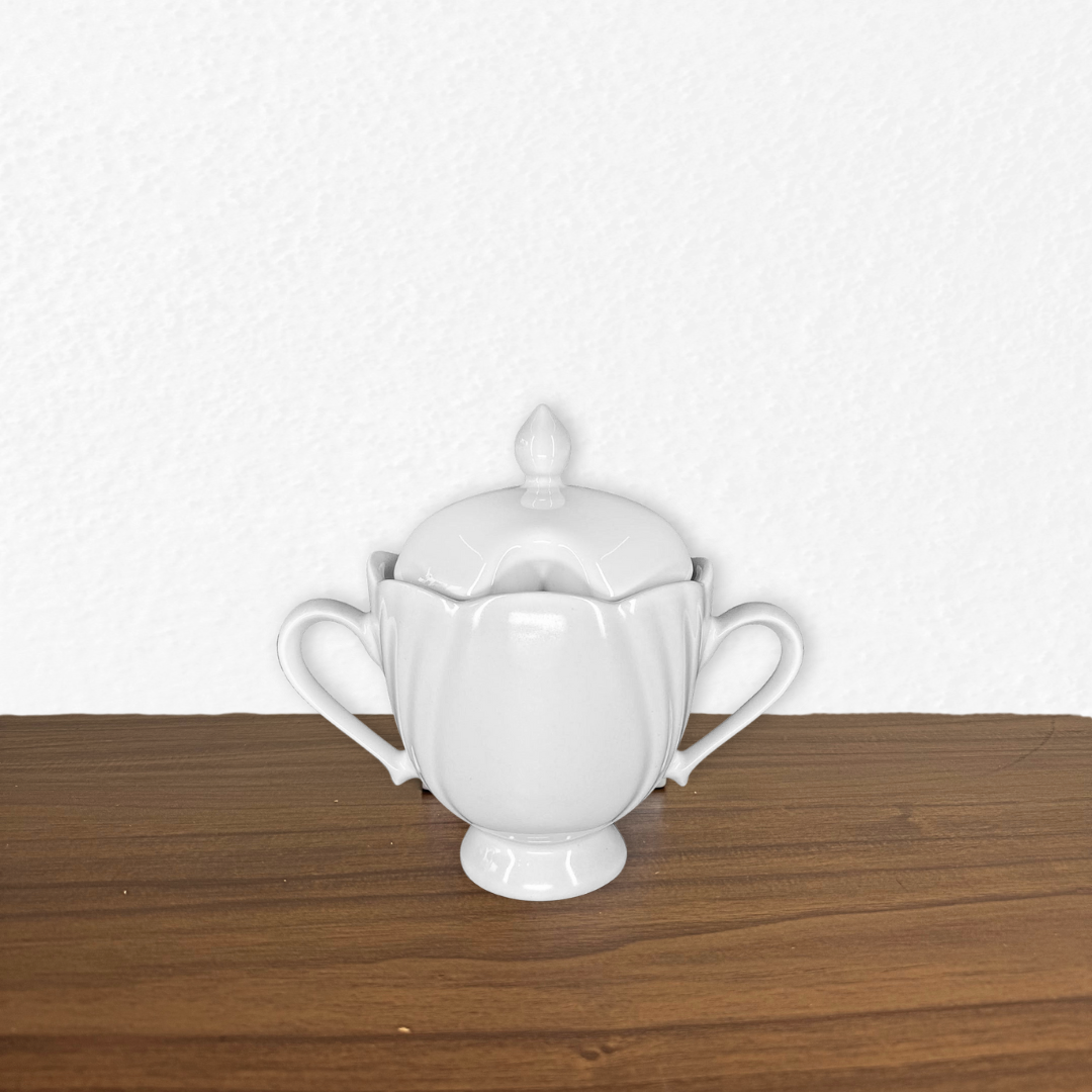 Açucareiro em porcelana branca da linha Soleil, com relevo delicado e alças laterais, ideal para compor a mesa com elegância e charme.