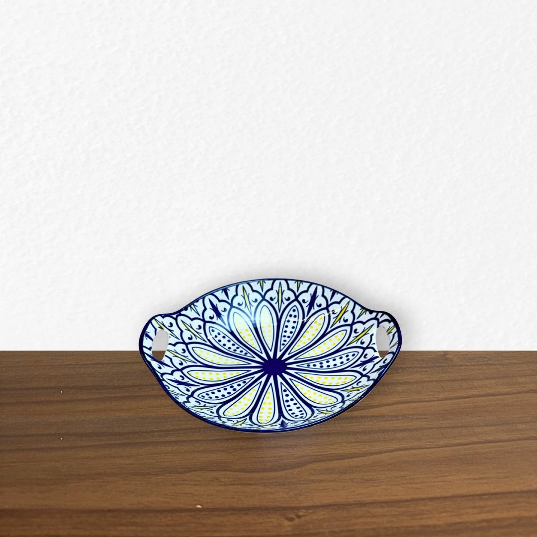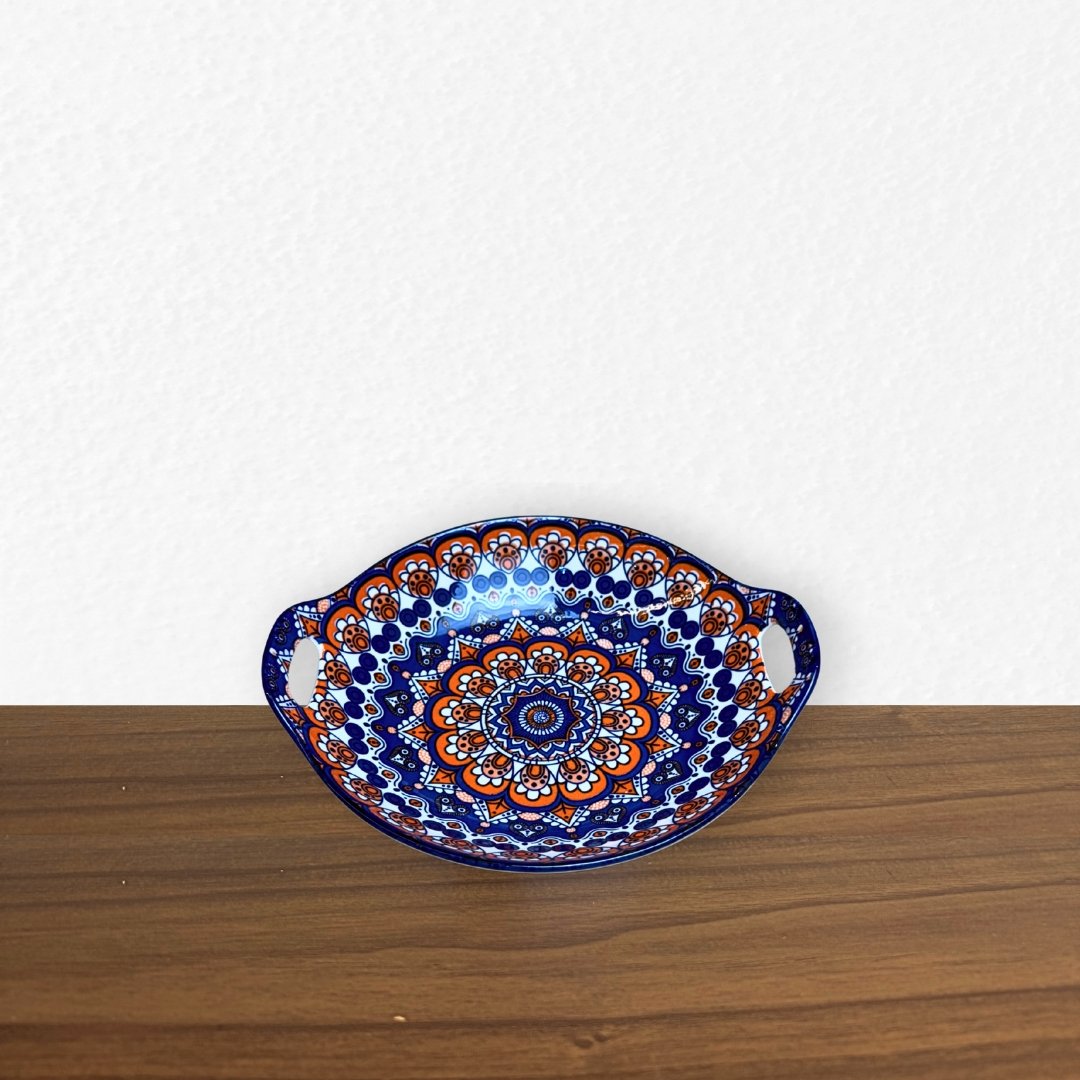 Travessa redonda em cerâmica com alças laterais, ideal para servir pães, aperitivos, petiscos ou acompanhamentos. Peça decorada que traz charme e destaque para a mesa.